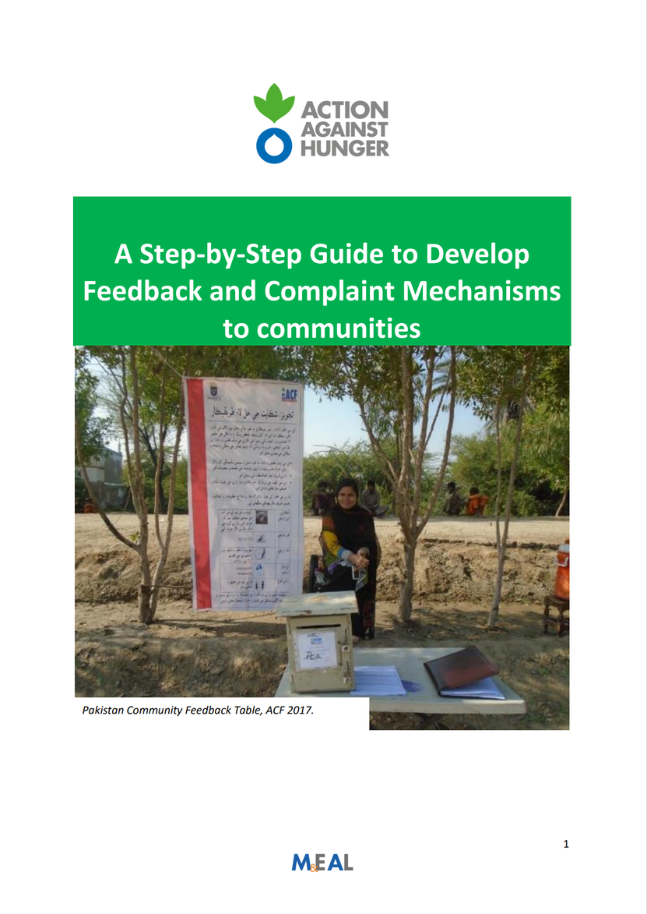 The purpose of this guide is to help Action Against Hunger staff in the design and set up of feedback and complaint mechanisms to communities in a practical and efficient way. Its intention is to be an easy and quick read as well as to provide enough reference documents and tools for practitioners. It complements the content and tools on Accountability available through Action Against Hunger’s Multi-Sector Monitoring and Evaluation Guidelines.