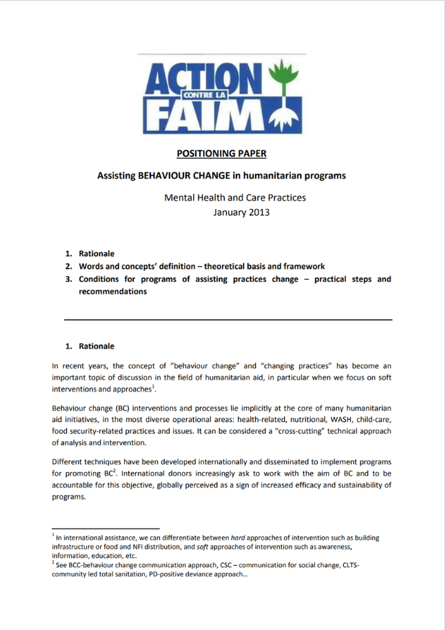 In recent years, the concept of “behaviour change” and “changing practices” has become an important topic of discussion in the field of humanitarian aid, in particular when we focus on soft interventions and approaches.