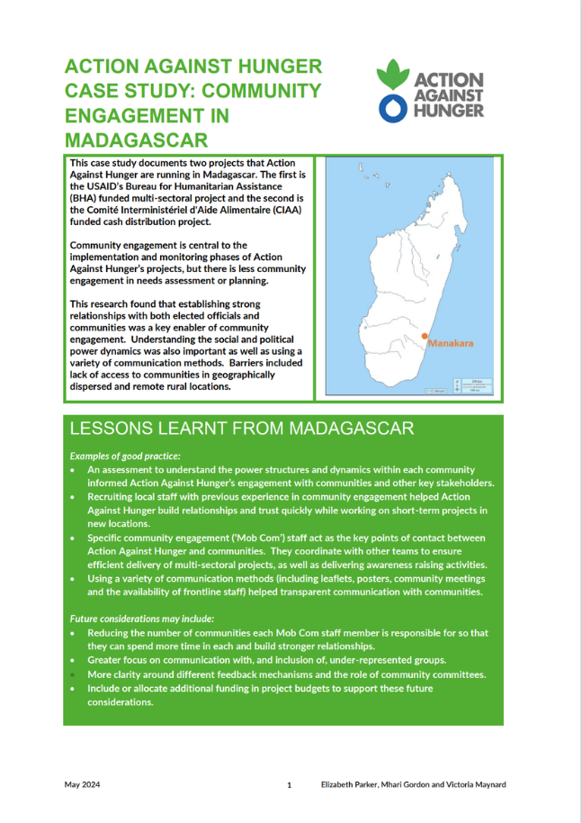 This case study documents two projects that Action Against Hunger are running in Madagascar. The first is the USAID’s Bureau for Humanitarian Assistance (BHA) funded multi-sectoral project and the second is the Comité Interministériel d’Aide Alimentaire (CIAA) funded cash distribution project.