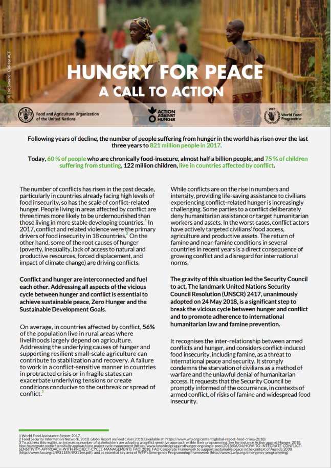 Action against Hunger, FAO and WFP seized the Paris Peace Forum opportunity to raise their voices to press all stakeholders to strengthen commitments to ending hunger and lay the foundation for stable, peaceful, resilient societies. This document is a joint Call to Action, launched on November 11 (2018), aiming to improve global governance on the issues at stake and to promote collective and concrete actions. It builds on the unanimous adoption of the UNSC Resolution 2417 (2018), which recognises the inter-relationship between armed conflicts and hunger and considers conflict-induced food insecurity as a threat to international peace and security. This Resolution also strongly condemns the starvation of civilians as a method of warfare and the unlawful denial of humanitarian access, and requests that the Security Council be promptly informed of the occurrence, in contexts of armed conflict, of the risk of famine and widespread food insecurity. 4 recommendations are presented to break the vicious cycle between hunger and conflict: