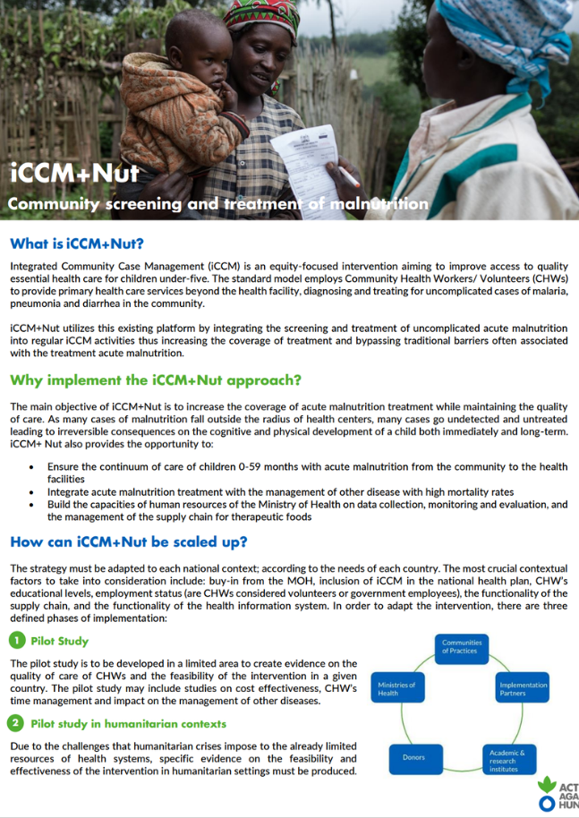 iCCM+Nut utilizes this existing platform by integrating the screening and treatment of uncomplicated acute malnutrition into regular iCCM activities thus increasing the coverage of treatment and bypassing traditional barriers often associated with the treatment acute malnutrition.