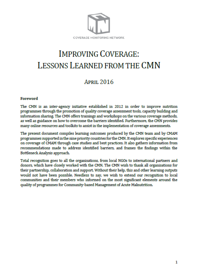 The CMN was an inter-agency initiative established in 2012 in order to improve nutrition programmes through the promotion of quality coverage assessment tools, capacity building and information sharing. The CMN offered training and workshops on the various coverage methods,