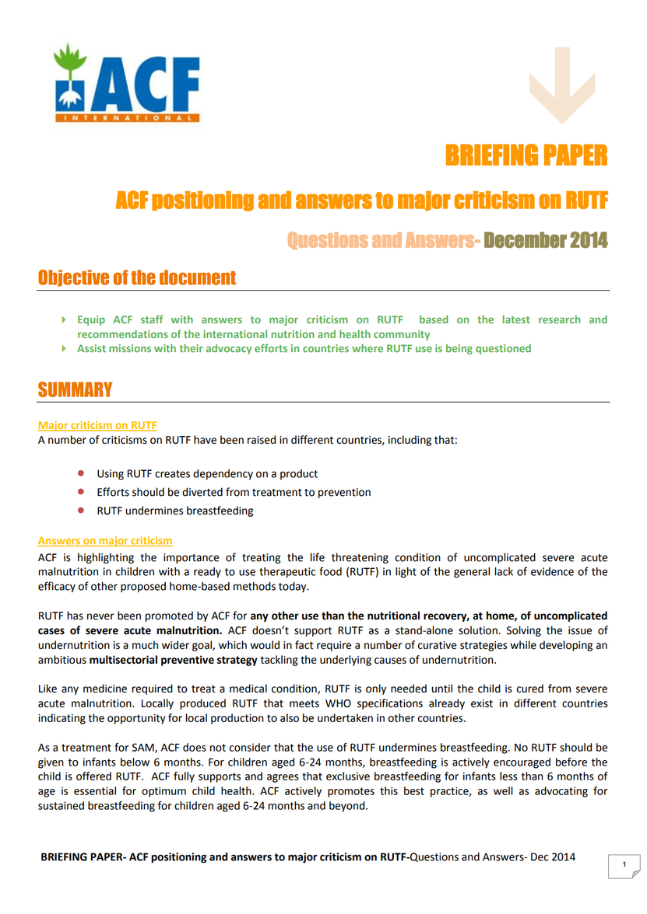 – Equip ACF staff with answers to major criticism on RUTF based on the latest research and recommendations of the international nutrition and health community