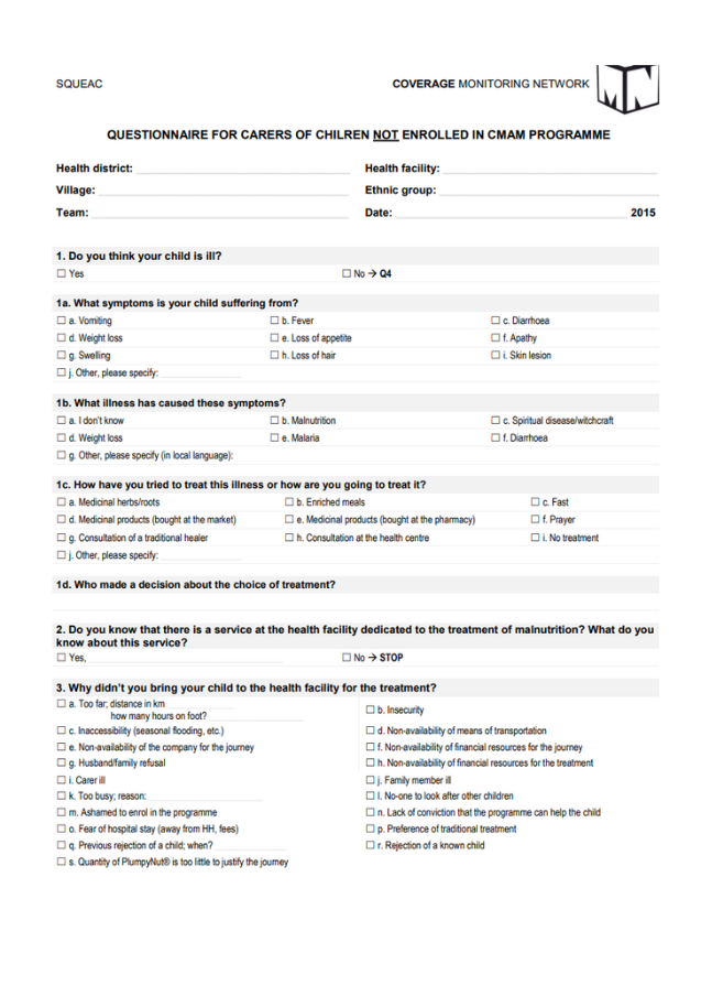 This document provides the questionnaire for cares of non-enrolled SAM children in the CMAM programme.