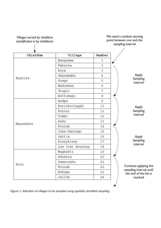 - Preparing the village or community list: List all villages or communities in the survey by health centre or chiefdom and number the villages from the top. Breaking the villages down by the catchmentarea of diff erent health centres or chiefdoms ensures a spatially representative sample.